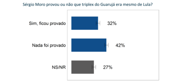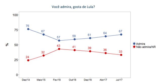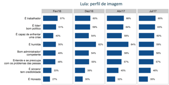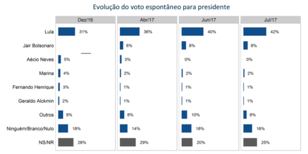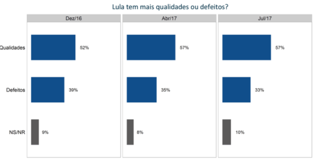 Lula sobe dois pontos, tanto nas pesquisas de intenção espontânea (de 40 para 42%), o único a apresentar alterações frente ao levantamento de junho. Nas pesquisas estimuladas, tanto com Geraldo Alckmin como candidato tucano quanto com João Doria neste papel, Lula atinge 47 e 48%, dois e três pontos a mais que na pesquisa anterior. Mesmo jogando para baixo toda as margens de erro, não encolheu, se é que não teve um acréscimo estatisticamente marginal.