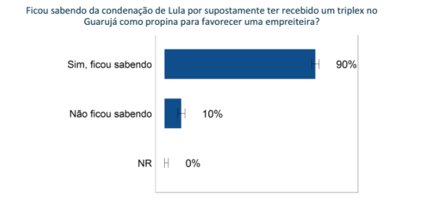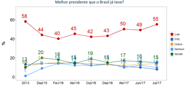 Lula sobe dois pontos, tanto nas pesquisas de intenção espontânea (de 40 para 42%), o único a apresentar alterações frente ao levantamento de junho. Nas pesquisas estimuladas, tanto com Geraldo Alckmin como candidato tucano quanto com João Doria neste papel, Lula atinge 47 e 48%, dois e três pontos a mais que na pesquisa anterior. Mesmo jogando para baixo toda as margens de erro, não encolheu, se é que não teve um acréscimo estatisticamente marginal.