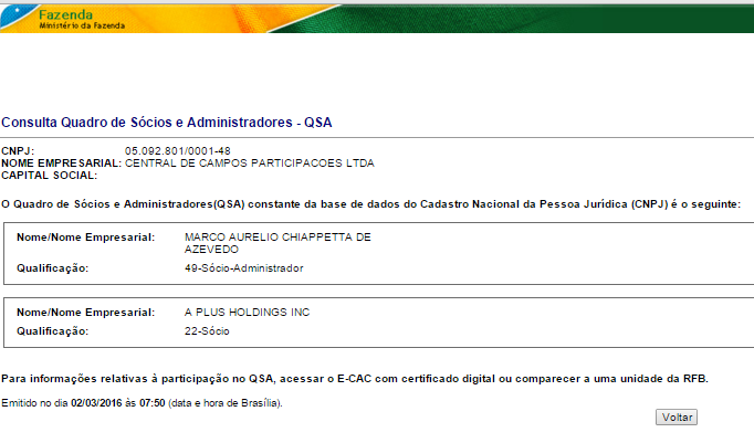A Central de Campos, CNPJ 05.092.801/0001-48, por sua vez, é controlada por Marco Aurélio, também partilha o mesmo endereço da Bulhões de Carvalho, 296 e tem no seu contrato social a participação da Plus Holding, outra empresa panamenha montada pela Mossack Fonseca, como mostrou, dias atrás, o blog Os amigos do Presidente Lula, com certidão.