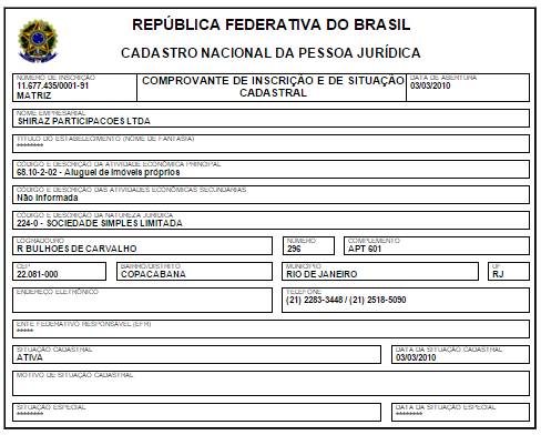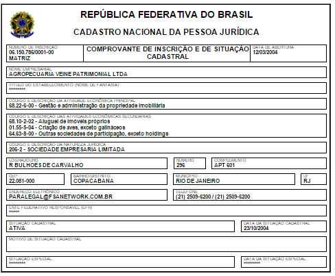 A Agropecuária Veine Patrimonial, CNPJ 06.150.786/0001-00, registrou a Rua Bulhões de Carvalho, 296/601 como seu endereço no Ministério da Fazenda. É a dona, no papel, da casa irregular. É controlada pela Vaincre LLC, registrada no paraíso fiscal do estado de Nevada (Las Vegas), nos EUA.