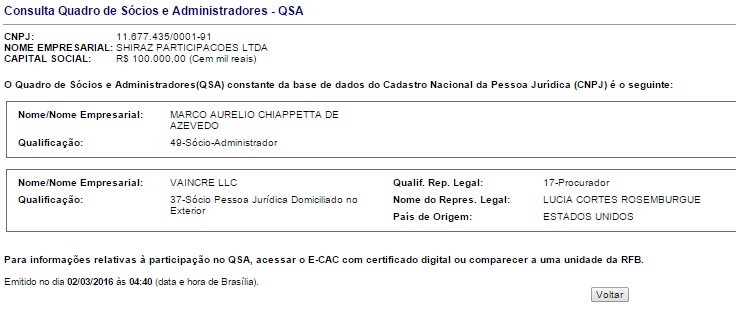 A Vaincre LLC, uma empresa de fachada, controla também outra empresa no mesmo endereço, a Shiraz Participações, CNPJ 11.677.435/0001-91, onde consta como administrador Marco Aurélio de Azevedo, pai e procurador de Alexandre Chiappetta de Azevedo e da Central de Campos Participações na Glem Participações, que assumiu o controle de um bem público, como revelou o Viomundo: o Estadio de Remo da Lagoa, ação na qual assina o casal Paula-Alexandre.